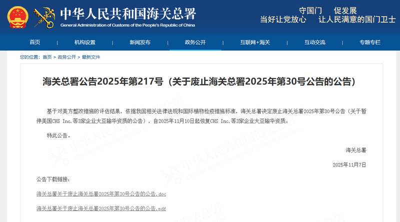 新京报讯 据海关总署消息,根据日本相关法律和国际植物检疫标准,根据美国纠正措施评估结果,海关总署决定废止海关总署2025年第30号公告(关于暂停CHS等3家企业大豆出口资格的公告),恢复CHS等3家企业大豆出口资格。 2025 年 11 月 10 日起在美国上市 Inc. 出版人 毛天宇